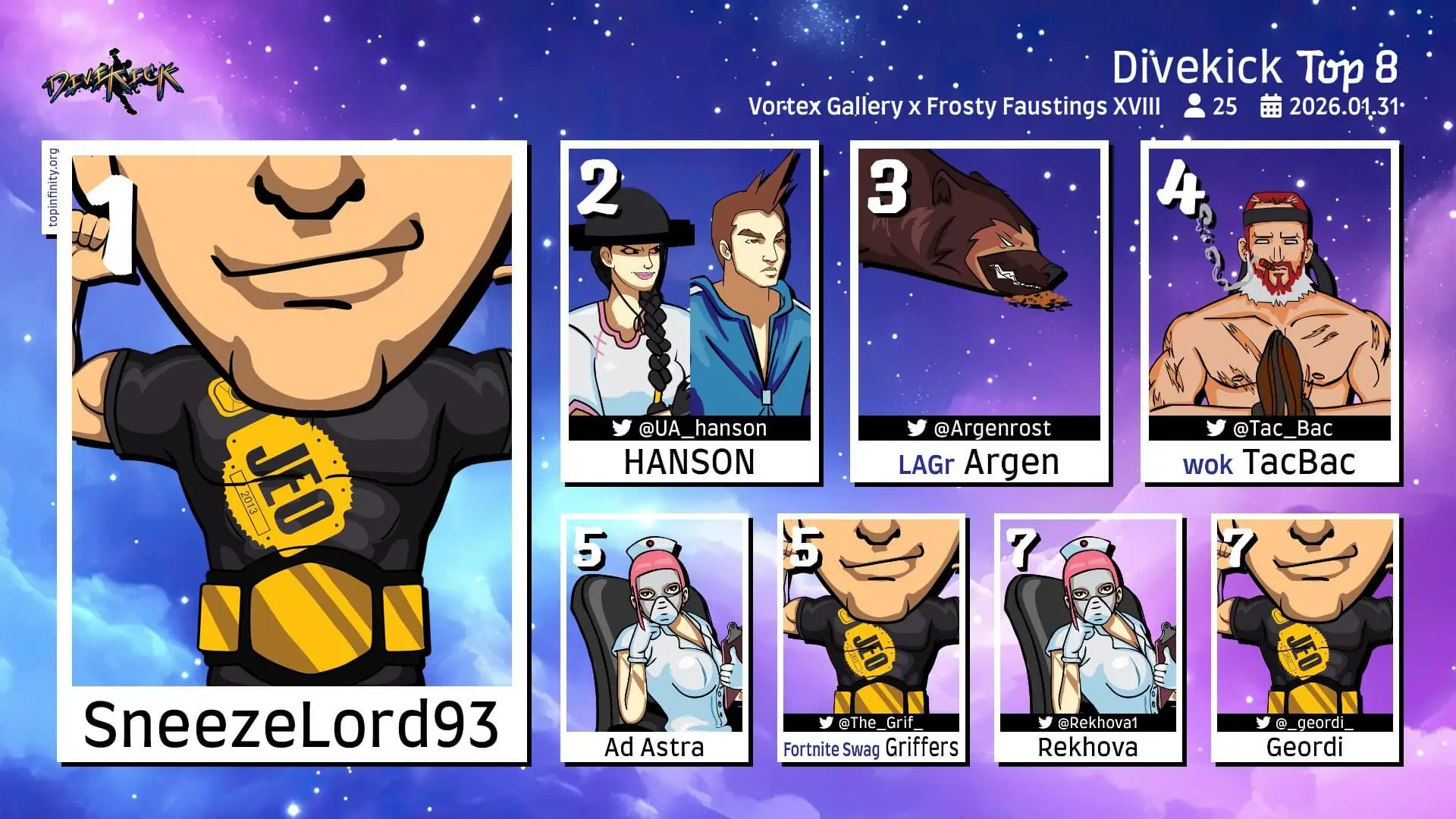 Thursday kicked things off with Vortex Gallery’s Killer Instinct bracket. This year shifted to a Top 8 battle on stream for community members to enjoy. Frosty’s Top 8 featured six unique characters. LAGrGaming continued their support for the KI community by sponsoring another trophy for this year’s champion. Grand Finals saw a rematch of the Winners Final match between last year’s winner, Bass, and one of Evo 2025’s top competitors, FrodoTbagginzz. Bass confidently played Eagle and Spinal, earning himself another Frosty Faustings trophy.